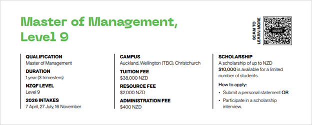 ② 단 1년 만에 NZQF Level 9 석사 학위 취득과 취업 기회 고려 가능