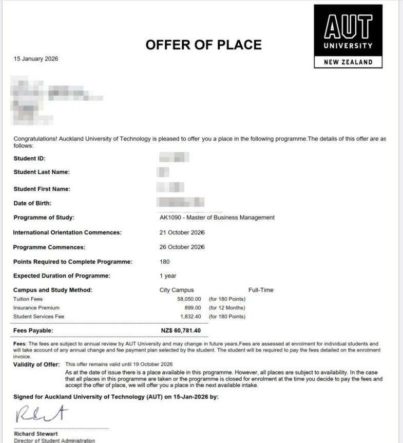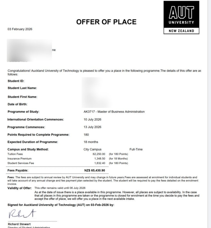 AUT 오클랜드 공과대학교 비즈니스 석사 입학허가서 안내